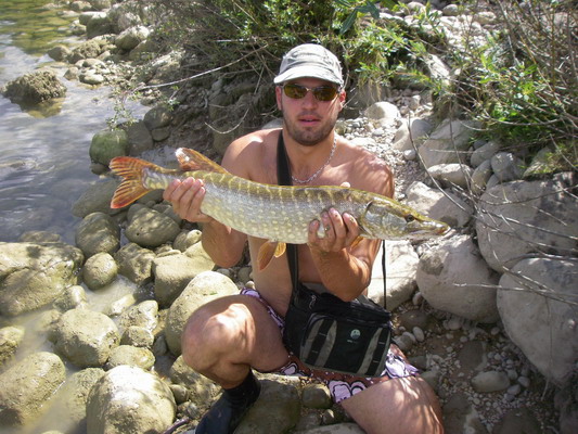Au prise avec un beau brochet de la riviere d’ain