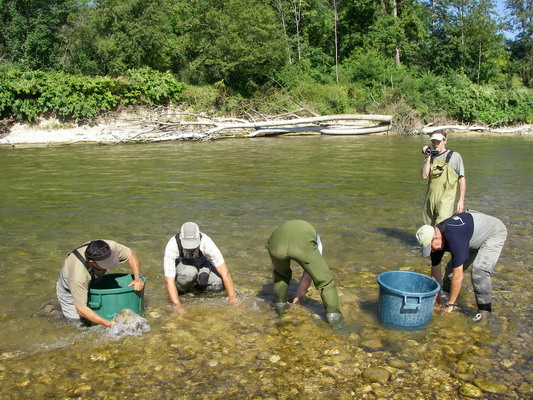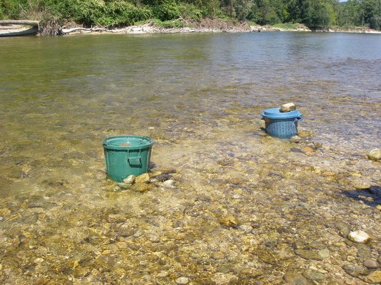 Mise en place des poubelles dans lequels les truites et les ombres vont séjourner